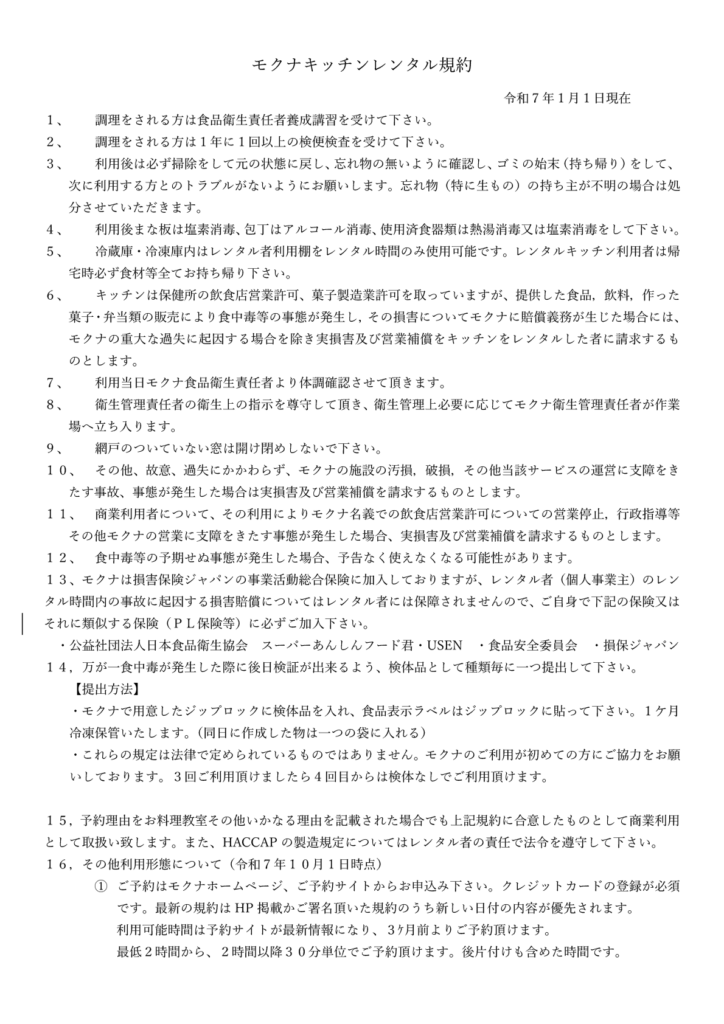 - 商業利用者について、その利用によりモクナ名義での飲食店営業許可についての営業停止,行政指導等その他モクナの営業に支障をきたす事態が発生した場合、実損害及び営業補償を請求するものとします。