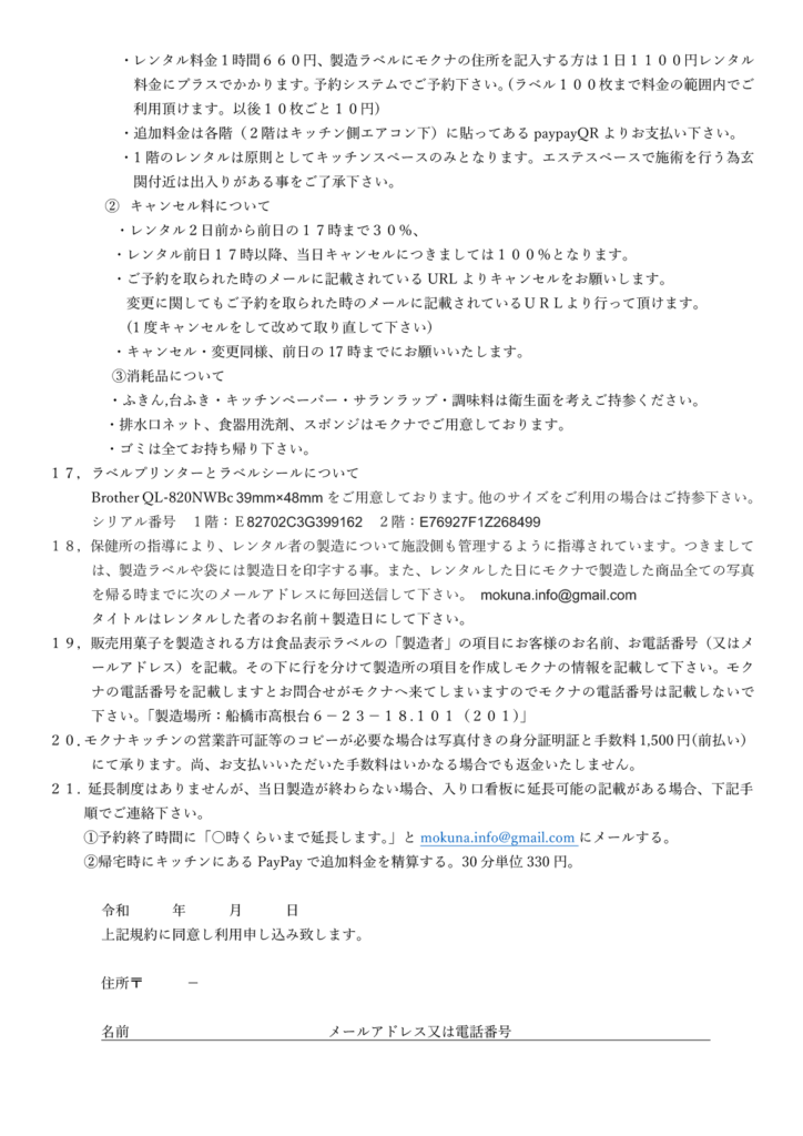 保健所の指導により、レンタル者の製造について施設側も管理するように指導されています。つきましては、製造ラベルや袋には製造日を印字する事。また、レンタルした日にモクナで製造した商品全ての写真を帰る時までに次のメールアドレスに毎回送信して下さい。 mokuna.info@gmail.com